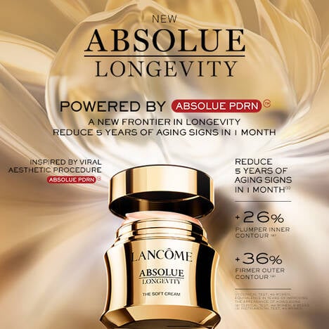 Absolue Longevity The Soft Cream is Lancôme's first topical PDRN cream, clinically proven to reduce 5 years of aging signs in 1 month¹. Powered by Pro-Xylane™ and Absolue Perpetual Rose Extract™, it energizes skin cells and restores vitality, delivering firmer, lifted, and radiant skin.